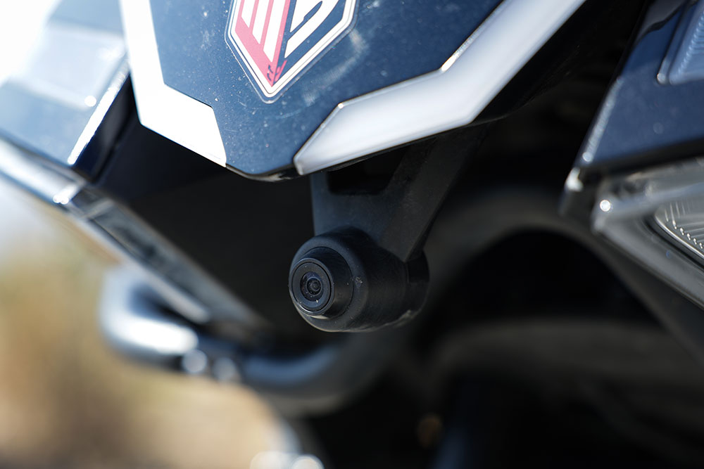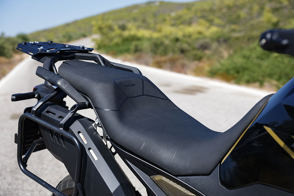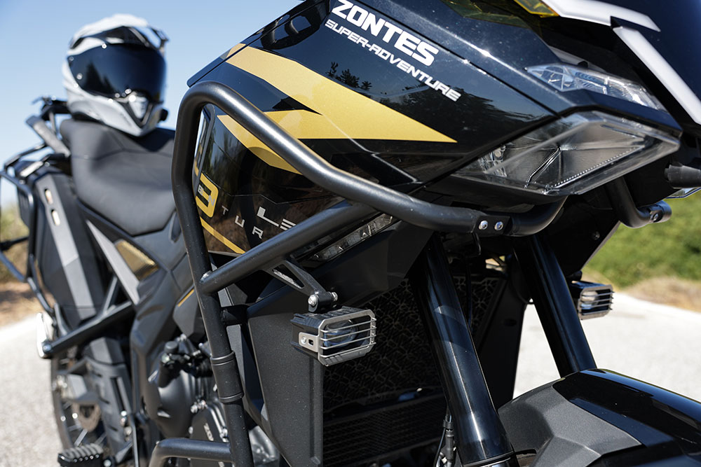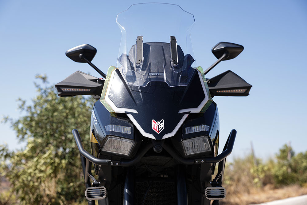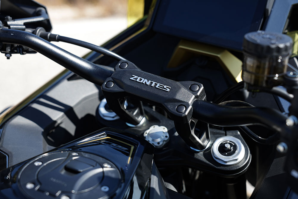 Ο ηλεκτρονικός εξοπλισμός είναι αρκετά πλούσιος για τη τιμή που “χτυπάει” η μοτοσυκλέτα: περιλαμβάνει έγχρωμη TFT οθόνη, σύστημα ελέγχου πρόσφυσης (traction control), δυο χάρτες λειτουργίας (Eco / Sport), σύστημα keyless, θύρες USB, δυο ενσωματωμένες μικρές κάμερες με ενσωματωμένη αποθήκευση (128 GB) ώστε να καταγράφουν τον δρόμο πίσω και μπροστά. Επιπλέον, υπάρχουν δυνατότητες όπως μέτρηση πίεσης ελαστικών (TPMS), θερμαινόμενα grips και ρυθμιζόμενη ζελατίνα — χαρακτηριστικά που συνήθως βλέπεις σε ακριβότερα μοντέλα. Επίσης διαθέτει μπαταρία λιθίου, όπως στα μοντέλα Premium, η οποία μάλιστα κατασκευάζεται από την ίδια την Zontes (1,2 kg).