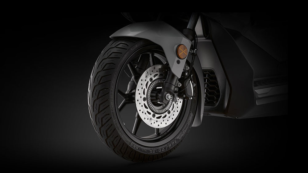 Το νέο μοντέλο διαθέτει κορυφαίο πακέτο ασφαλείας. Ο μπροστινός τροχός φέρει δίσκο 256 mm με δισπίστονη δαγκάνα, ενώ ο πίσω τροχός δίσκο 240 mm με δαγκάνα Ø34, χαρίζοντας ισχυρή και προοδευτική πέδηση. Το δικάναλο ABS επεμβαίνει διακριτικά, διατηρώντας τον έλεγχο ακόμη και σε συνθήκες χαμηλής πρόσφυσης.