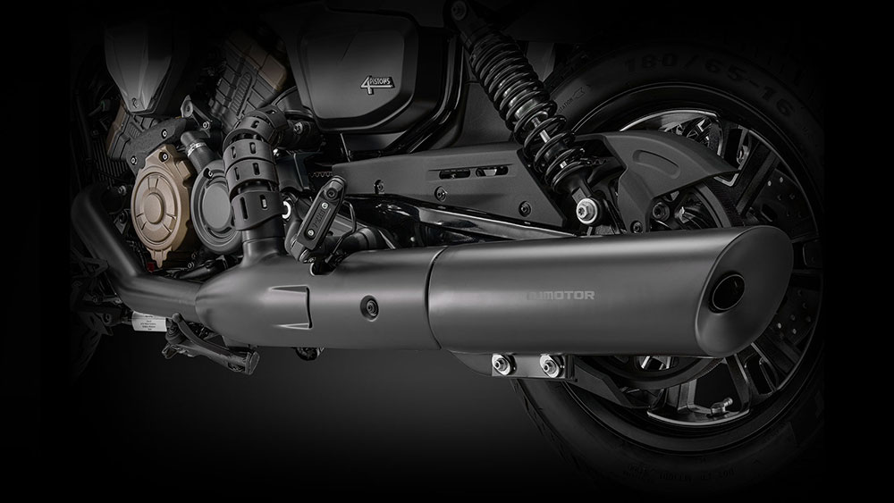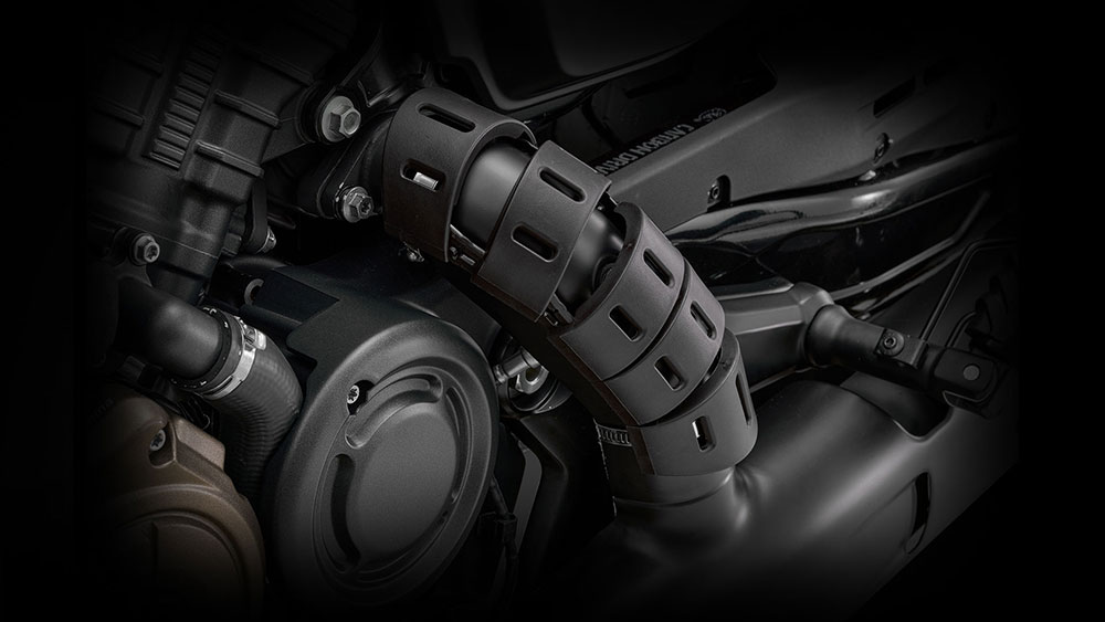 Οι διπλές εξατμίσεις σε κάθε πλευρά προσθέτουν συμμετρία και αναδεικνύουν τον χαρακτήρα του V4, ενώ τα προστατευτικά στους λαιμούς συμβάλλουν τόσο στην πρακτικότητα όσο και στην industrial αισθητική του συνόλου.