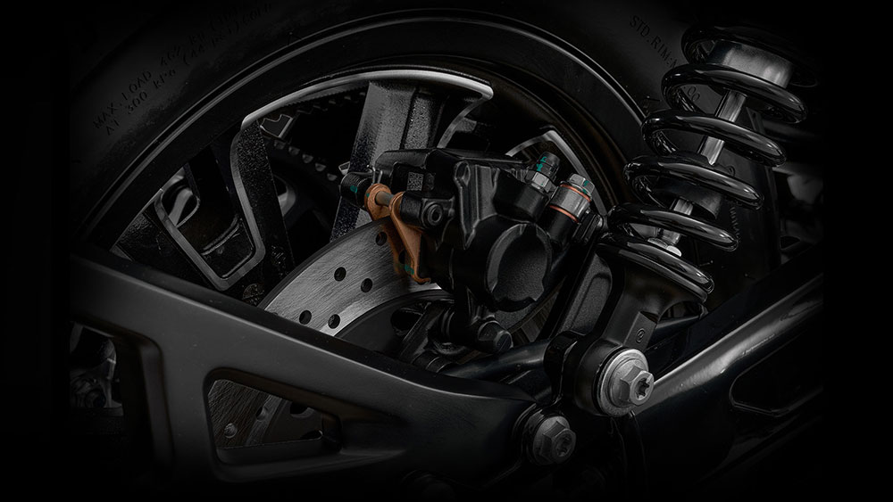 Η πέδηση ανατίθεται σε δύο δίσκους 300 mm εμπρός με τετραπίστονες ακτινικές δαγκάνες, και δίσκο 260 mm πίσω με δαγκάνα μονού εμβόλου, σε συνεργασία με δικάναλο ABS για ισχυρή και προβλέψιμη επιβράδυνση. Το απενεργοποιούμενο σύστημα TCS (Traction Control System) συμβάλλει στον έλεγχο πρόσφυσης σε ολισθηρές επιφάνειες, προσφέροντας επιπλέον επίπεδο ασφάλειας και σιγουριάς στον αναβάτη.